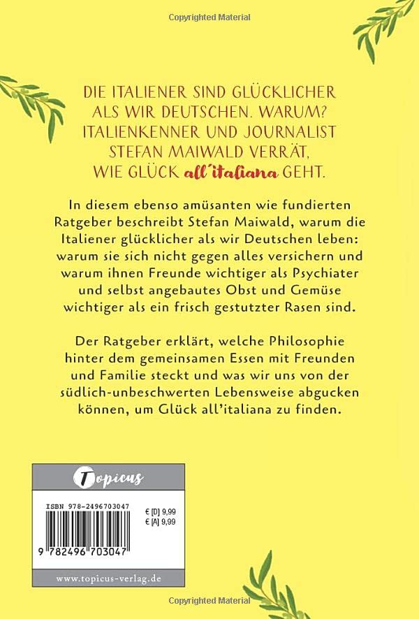 In diesem ebenso amüsanten wie fundierten Ratgeber beschreibt Stefan Maiwald, warum die Italiener glücklicher als wir Deutschen leben: warum sie sich nicht gegen alles versichern, ihnen Freunde wichtiger als Psychiater sind und selbstangebautes Obst und Gemüse wichtiger als ein frischgestutzter Rasen.