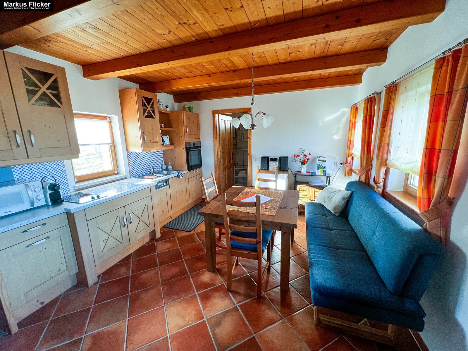 In der Küche findest du alles, was du für entspannte Urlaubstage brauchst. Dazu gehören ein Esstisch, Reinigungsmittel, Herdplatte, Backofen, Küchenutensilien, eine Spülmaschine, eine Mikrowelle und ein Kühlschrank. Das klingt zunächst nach einem praktischen Detail, ist im Urlaub aber oft entscheidend. Denn es macht dich flexibel. Du kannst frühstücken, wann du möchtest, regionale Produkte einkaufen, selbst kochen oder am Abend nach einem Ausflug noch gemütlich im Haus essen.