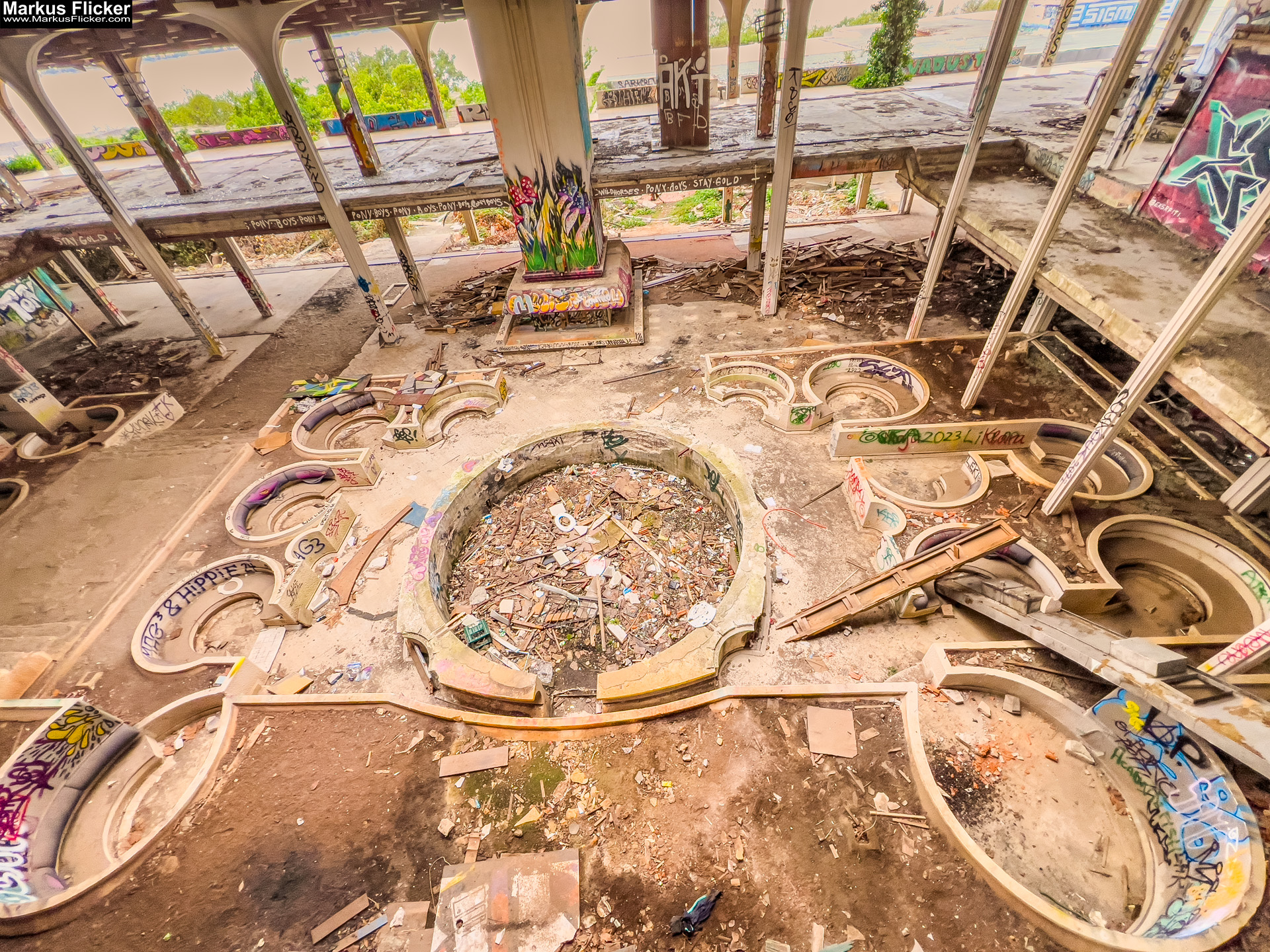 Ein weiteres faszinierendes Element des Haludovo Palace Hotels sind die Swimmingpools. Obwohl sie leer und unbenutzt sind, bieten sie eine beeindruckende Kulisse für Lost Place Photography. Die Strukturen der Pools und die Farben des verblassten Betons erzeugten eine unheimliche Atmosphäre, die ich in meinen Fotos einfangen wollte. Ich experimentierte mit verschiedenen Belichtungszeiten und Perspektiven, um die Schönheit und den Verfall der Pools zu zeigen.