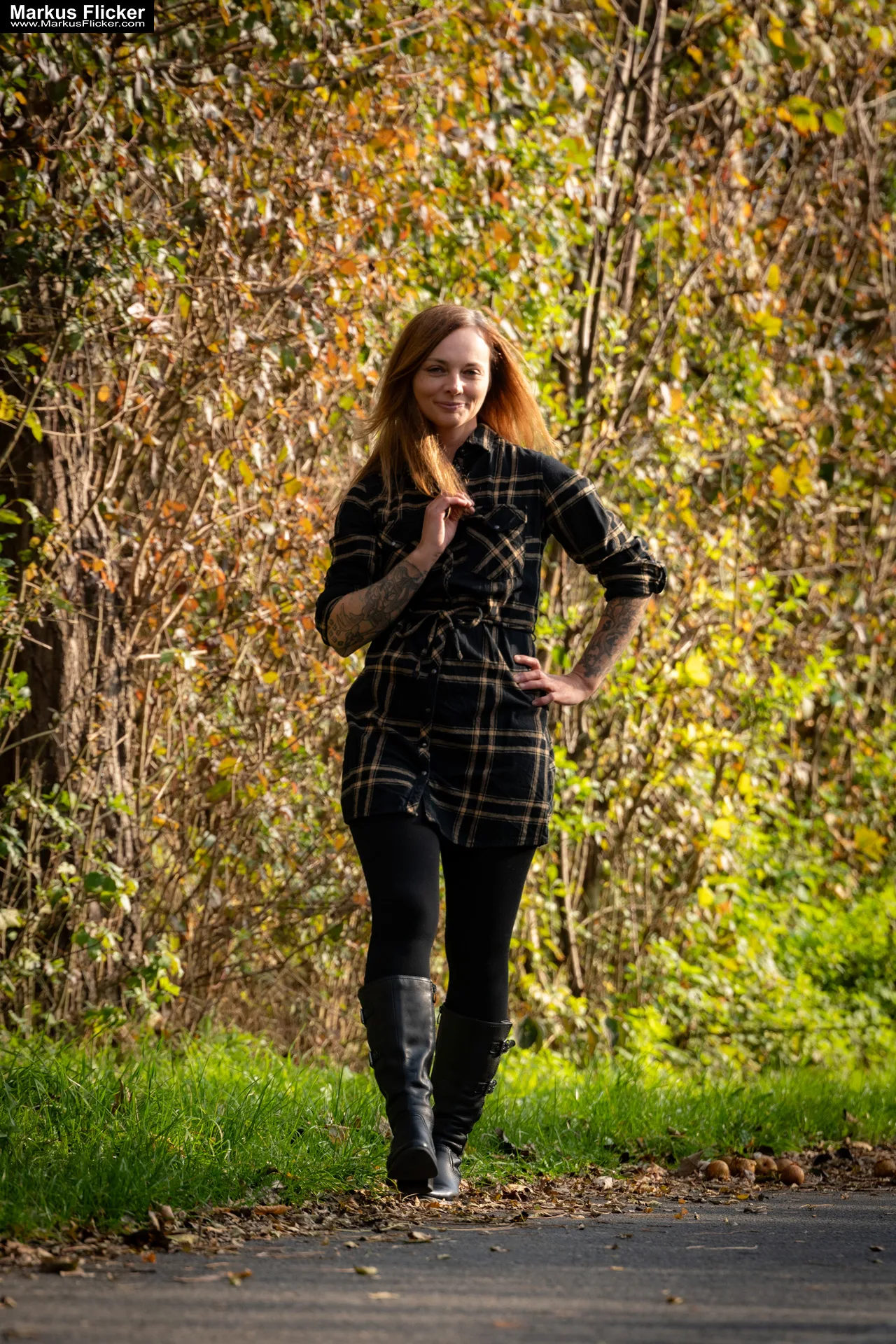 Verwende eine große Blende (z. B. f/1.8 oder f/2.8), um das Model vom Hintergrund zu trennen und das Laub in weiches Bokeh zu verwandeln.