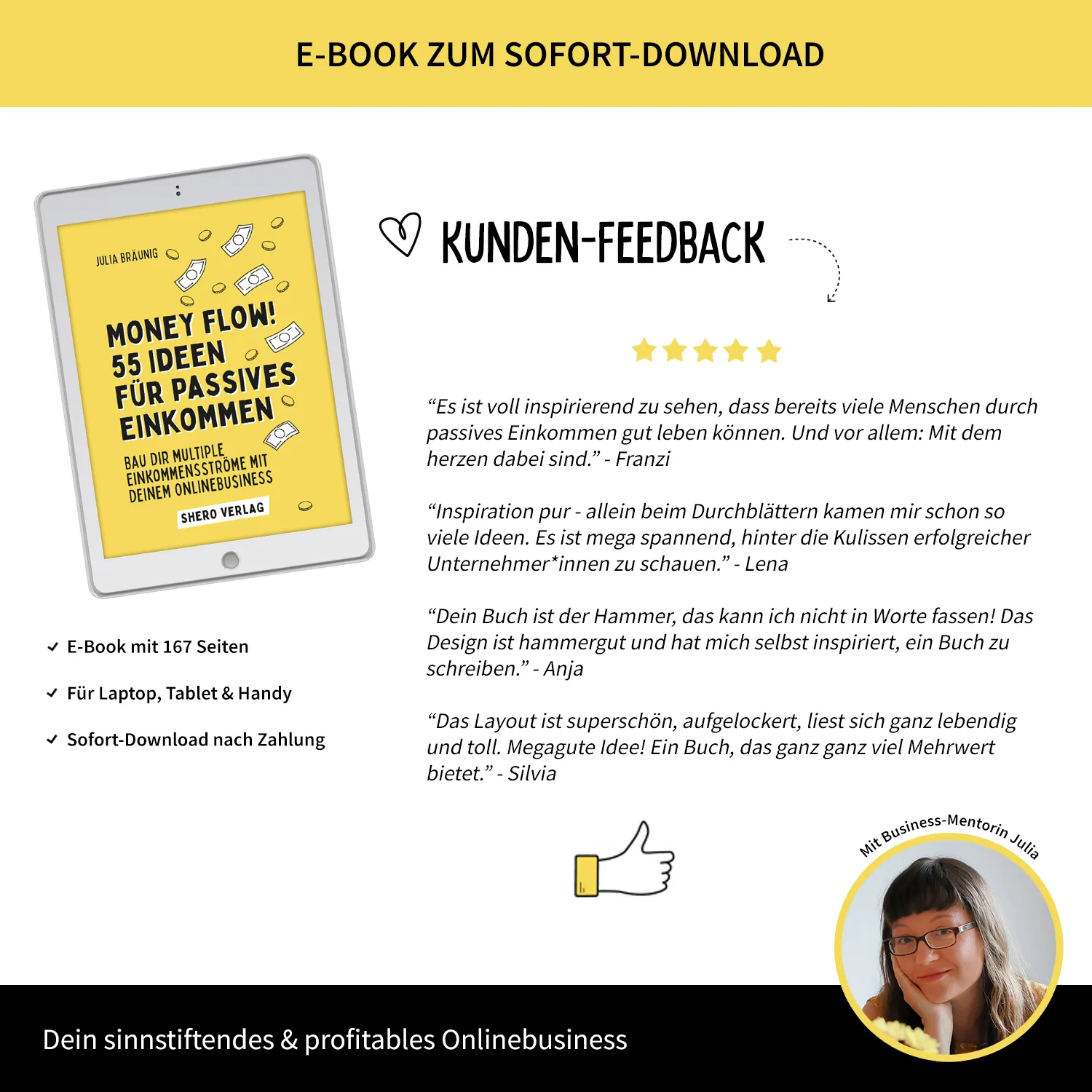 Julia Bräunig bringt über 18 Jahre Erfahrung im Bereich passives Einkommen und Onlinebusiness mit. Als Autorin, Coach für Female Empowerment und sinnstiftendes Onlinebusiness sowie Gründerin des SHERO-Verlags begleitet sie seit vielen Jahren selbstständige Frauen auf ihrem Weg in die finanzielle Unabhängigkeit.