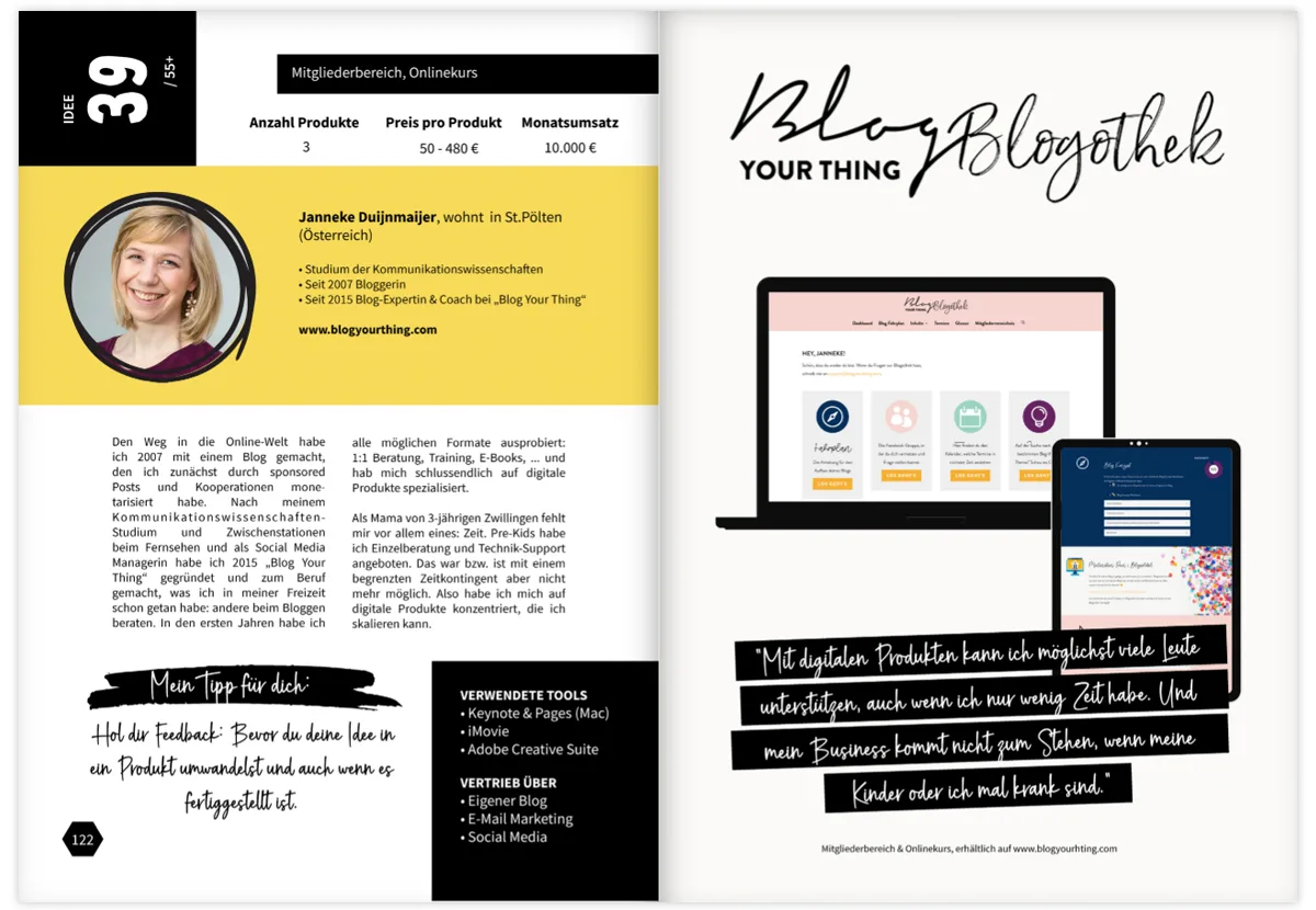 Mit dabei sind bekannte Namen aus der deutschsprachigen Onlinebusiness-Szene wie Katrin Hill im Bereich Business-Mentoring, Kathy Ursinus mit ihrem Fokus auf Content-Design, Janneke Duijnmaijer von Blog Your Thing, Maja Wörner mit ihrem ganzheitlichen Ansatz, Florian Wagner vom Geldschnurrbart, Jyotima Flak mit der Minikurs-Methode, Carmen Hercegfi von Vegane Familien, Peer Wandiger von Selbstständig im Netz, Simone Ludwig von Floh im Ohr TV, Anna Lecour von Paperless Life, Yannic Roithmaier von Artistant und viele weitere.