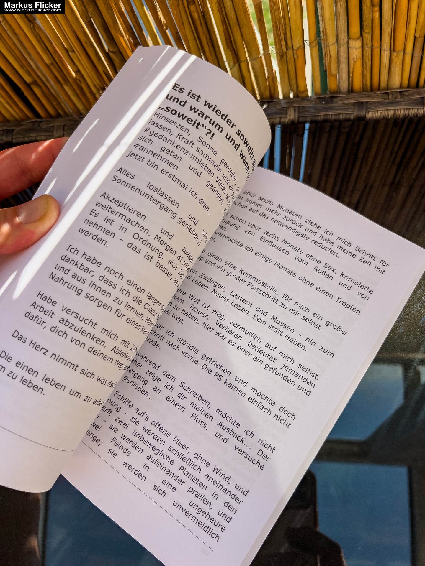 Mein Tagesablauf (Morgenroutine) startet automatisch mit einem Griff neben dem Bett und am iPad werden die neuesten Podcasts gestartet. Bett machen, mal eine Rauchen, Wasser runter schütten zum Wach werden, grob das Studio zusammenräumen, lüften, Staubsaugerroboter starten / falls auffindbar und ab ins Bad. Ich saß am Thron (du weißt schon was ich meine) und hörte weiter einen Podcast, und da kam wieder mal das übliche Thema -> der Lebensinhalt überhaupt -> einfach machen!