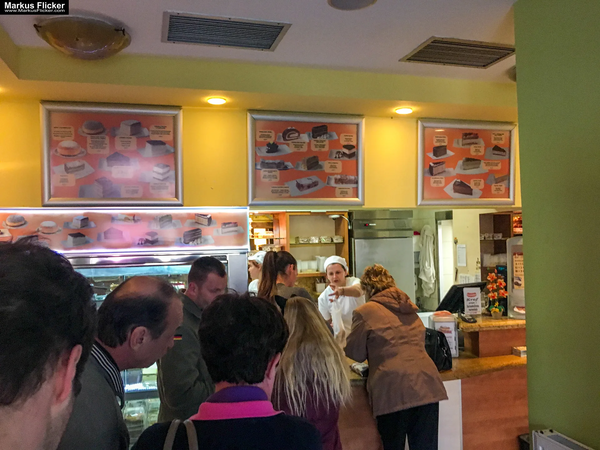 Dann steht man an der Theke und kommt aus dem Staunen nicht mehr heraus. Krapfen und sonstige Süßspeisen ohne Enden. Der Krapfen ist riesig groß und kostet € 1,50. Schokolade, Vanille, und sonstige Füllungen inkl. diversen Veredelungen mit Kokosstreusel und Co…