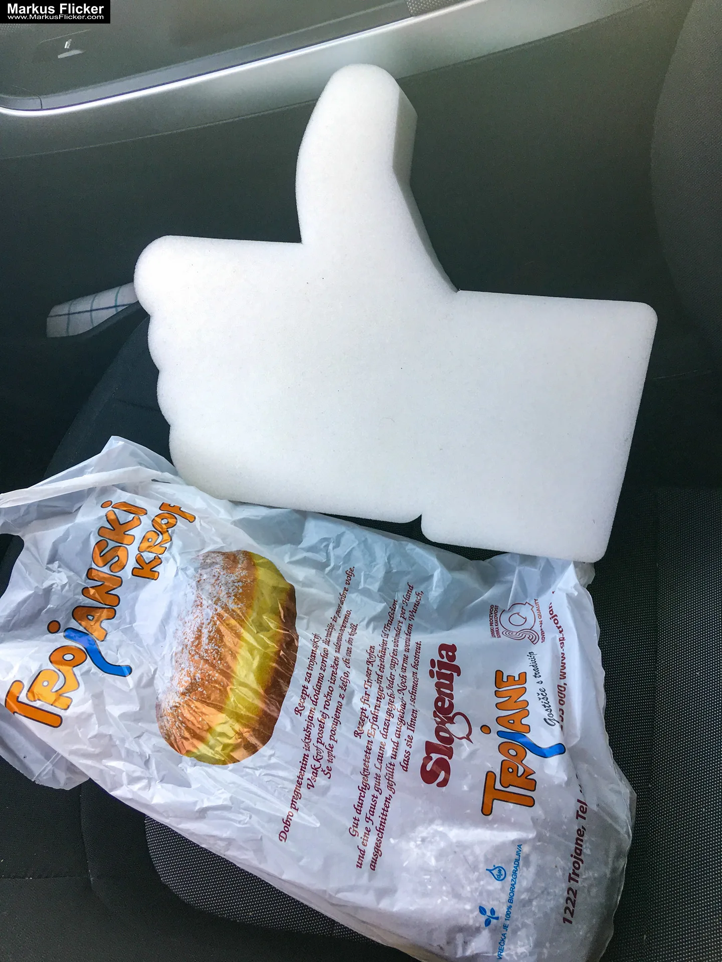 „Trojane“ mit einem Krapfen drauf – ok, schau ma einfach mal an… Gleich nach der Autobahnabfahrt kommt ein Kreisverkehr und dann lange mal nix. Eine kleine Ortschaft und sehr viel Landschaft… Ok, einfach mal weiter fahren und dem Navi folgen… Auf der linken Seite stehen dann auf einmal ein paar Häuser und ein großer Parkplatz. Überall findet man Bilder von Krapfen drauf.