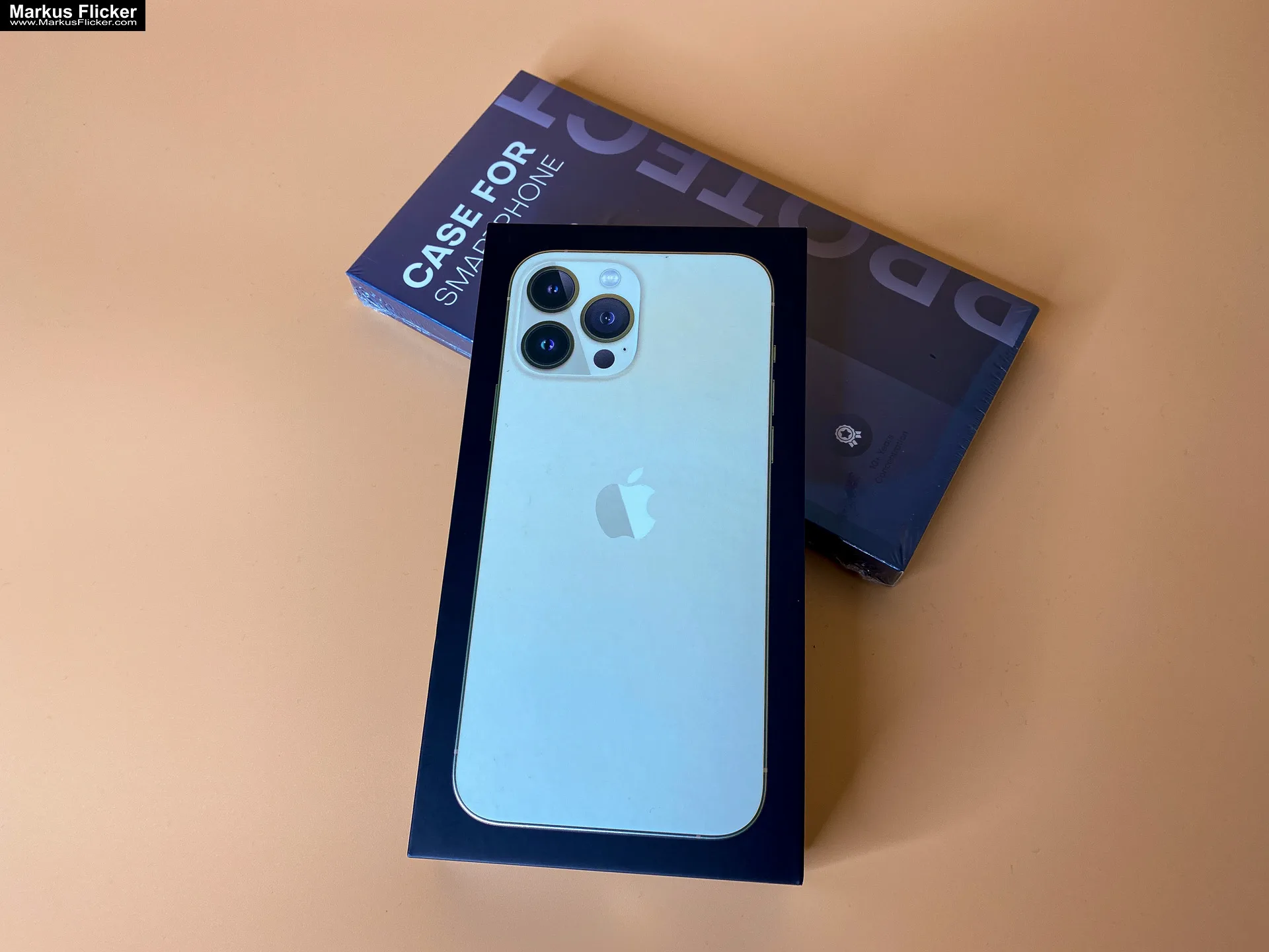 - Die Verpackung: Beim Unboxing fällt zuerst die hochwertige Verpackung auf. Der Karton ist in einem eleganten, matten Gold gehalten und zeigt auf der Vorderseite ein Bild des iPhones. Es fühlt sich wertig an und vermittelt den ersten Eindruck von Luxus.