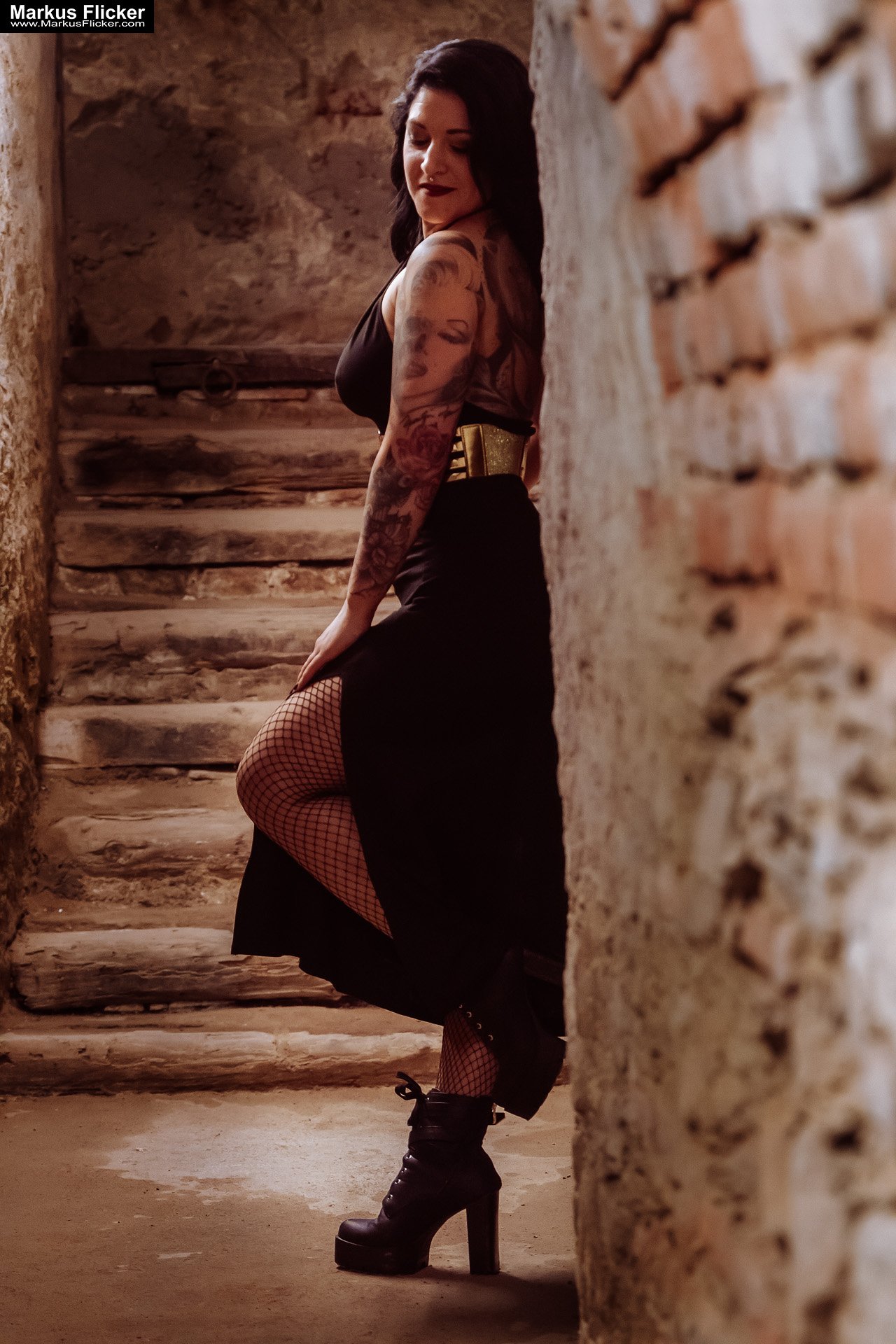 Das Kleid, das Elisa trug, war sorgfältig ausgewählt, um eine Balance zwischen Raffinesse und kühnem Ausdruck zu schaffen. Die metallischen Akzente des Gürtels funkelten im gedämpften Licht des Kellers und verliehen jedem Bild eine zusätzliche Dimension. Die Tattoos, die Elisas Arme und Oberkörper zierten, erzählten ihre eigene Geschichte und fügten sich nahtlos in das visuelle Narrativ des Shootings ein.